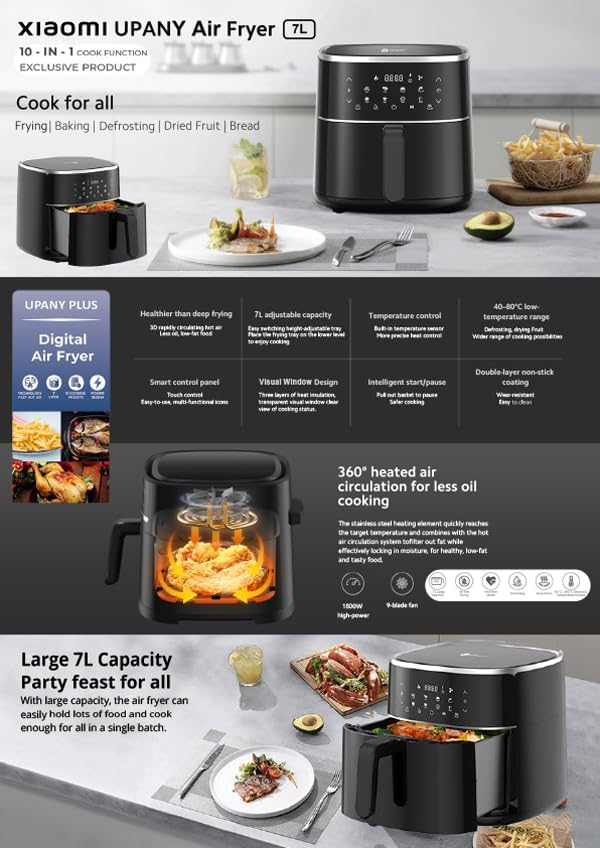 Xiaomi Mi Upany XXL Plus 7 lt Siyah Airfryer, geniş hacmi, yenilikçi sıcak hava teknolojisi ve çok yönlü pişirme özellikleri ile aile yemeklerinden büyük porsiyonlara kadar her türlü yiyeceği pratik ve sağlıklı şekilde hazırlamanızı sağlayan gelişmiş bir sıcak hava fritözüdür. Sıcak hava dolaşımı sayesinde yiyecekleri az yağ ile pişirir; dışı çıtır, içi yumuşak sonuçlar elde etmenizi sağlar.